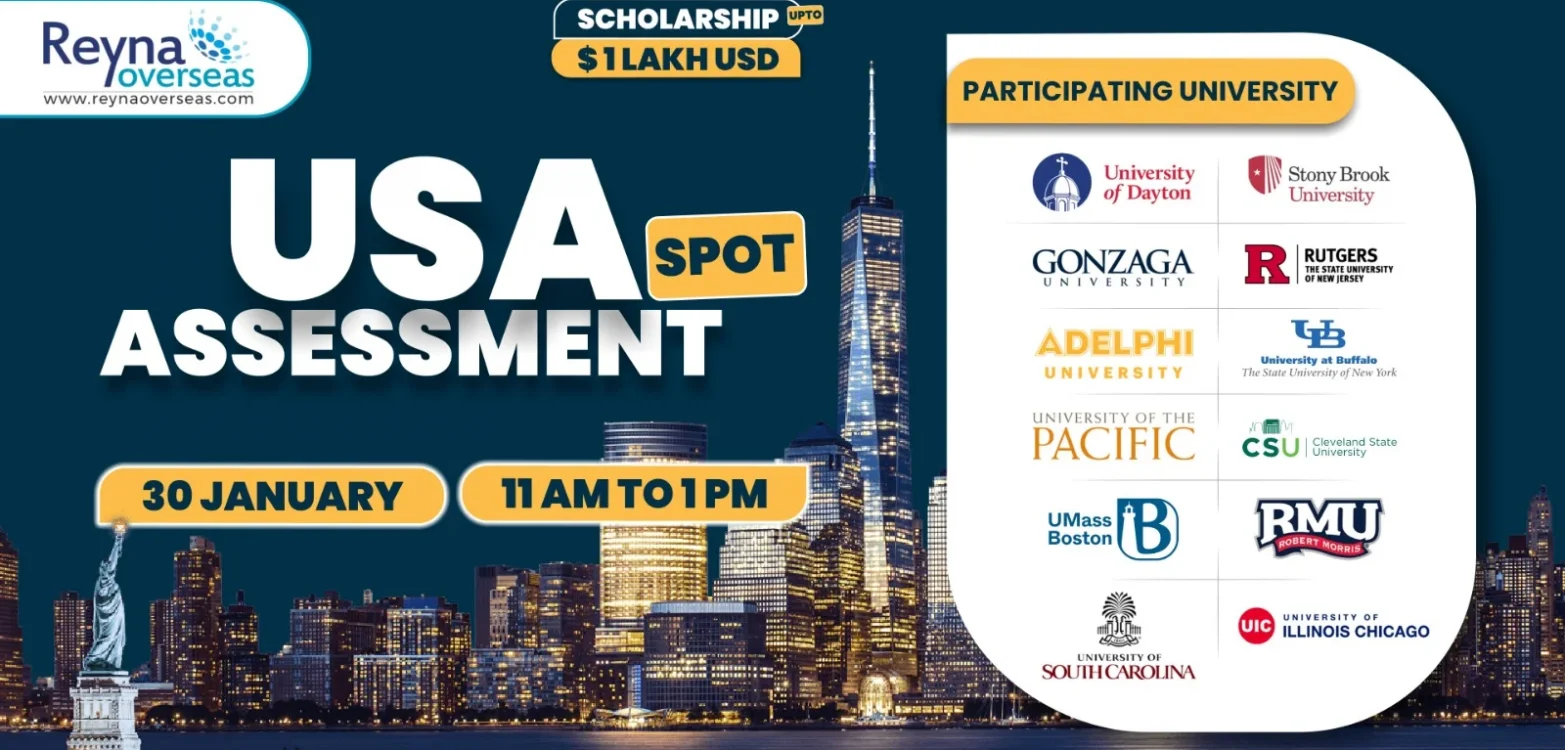 Reyna Overseas – Leading Study Abroad Consultants in Ahmedabad is organizing a USA Spot Assessment Event in Ahmedabad on 30th January 2025, where students can: